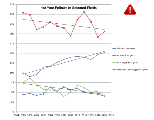 And, as usual, there just isn’t much good news to report. As the 13 years of data show, the overall trend is downward or flat in all three specializations in geriatrics: internal medicine, family medicine, and psychiatry. This year’s tiny uptick in internal medicine-based geriatric fellows is more than offset by the decline in family medicine and psychiatry. The fill rate for positions is still just around 50% meaning that there are as many funded slots empty as there are filled and the rates of “foreign medical graduates” in fellowship slots remains astoundingly high, indicating that US medical school training is still not setting physicians onto the path into the discipline. (And Pediatric Cardiology, our comparison group, seems to be back on its growth track. . .)